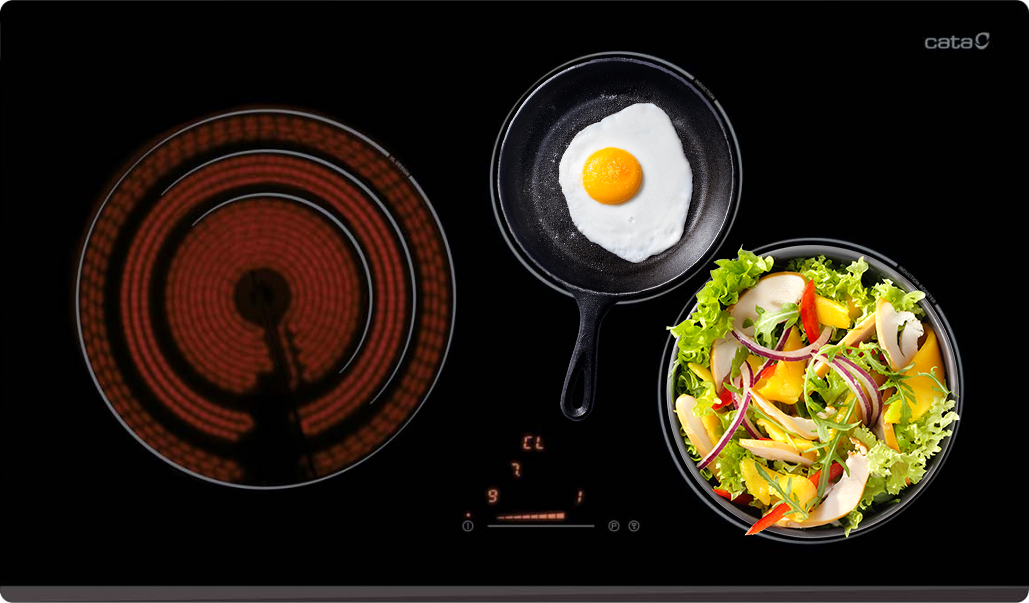 Vùng nấu hồng ngoại sử dụng đĩa nhiệt EGO Hi-light của Đức với độ bền cao, được chia thành 2 vòng ngắt nhiệt tùy chỉnh phù hợp với nhiều đáy nồi, nấu được tất cả các loại nồi. Với ưu điểm này việc chuyển đổi nồi từ nấu bếp gas sang nấu bếp điện từ Cata IT 773 là hoàn toàn phù hợp, giúp bạn tiết kiệm được chi phí đầu tư nồi ban đầu. Vùng nấu từ có khả năng nhận diện đáy nồi để gia nhiệt giúp tiết kiệm tối đa điện năng tiêu thụ, hiệu suất nấu tới 90% giúp bạn tiết kiệm đáng kể chi phí sinh hoạt hàng tháng cho gia đình.
