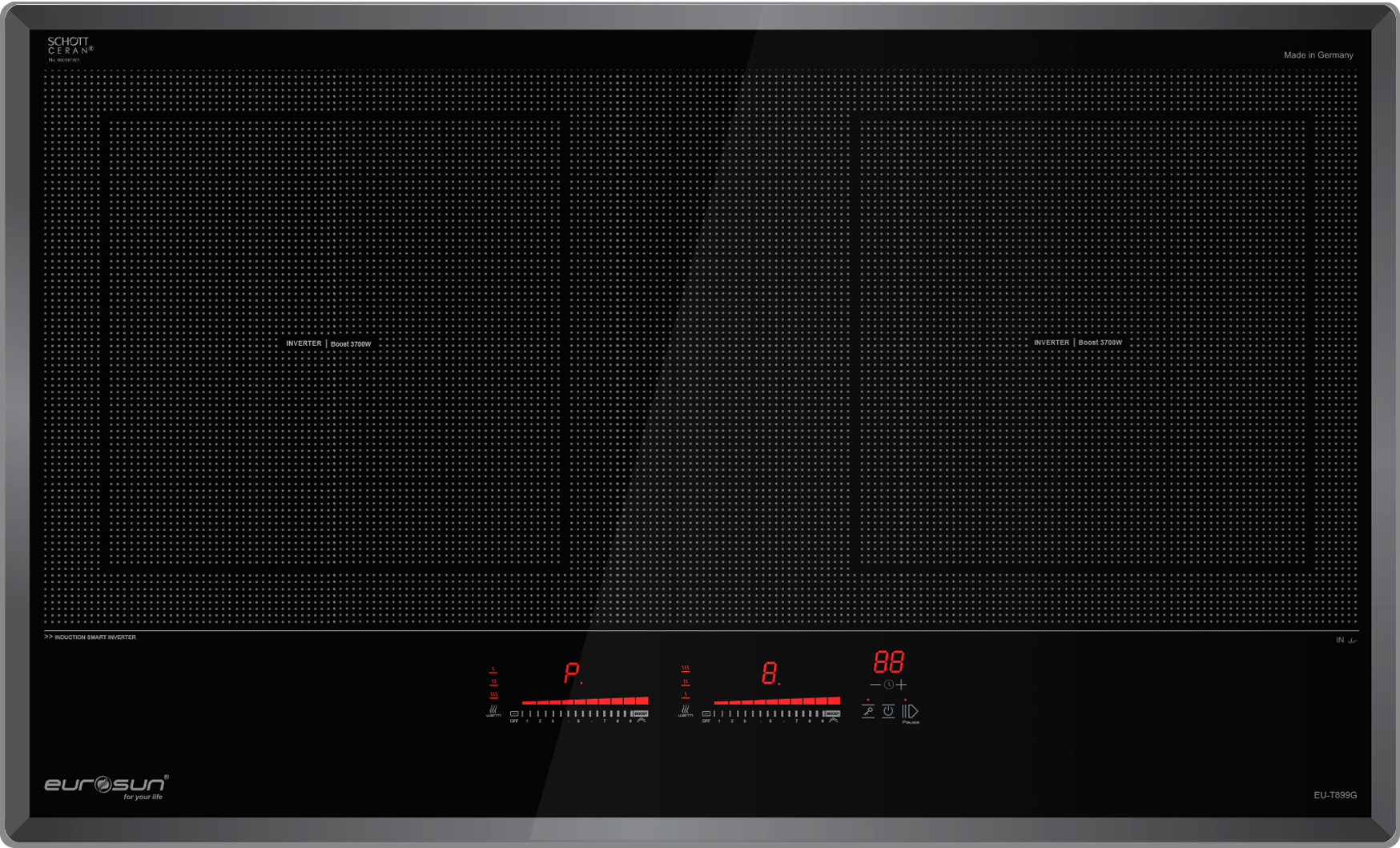 Bếp từ Eurosun EU-T899G là sản phẩm có thiết kế hai vùng nấu đặt âm sang