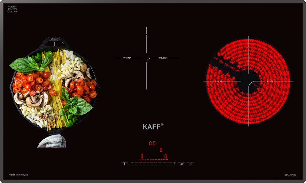 Bếp điện từ Kaff KF IC79H gồm 3 vùng nấu trong đó có 2 vùng nấu từ và 1 vùng nấu hồng ngoại với đường kính khác nhau, tương xứng với nhiều kích cỡ xoong nồi của gia đình bạn. Các vùng nấu được sắp xếp hài hòa, thuận tiện cho việc nấu cùng lúc 3 nồi lớn mà không bị va vào nhau. Bếp giúp nấu ăn nhanh hơn, rất phù hợp cho gia đình nhiều thành viên và những người nội trợ bận rộn. Bếp được trang bị mặt kính Schott Ceran cao cấp với khả năng chịu lựa và chịu nhiệt tốt nhất hiện nay. Kính thân thiện với môi trường, có khả năng chống trầy xước tốt, tản nhiêt nhanh và cách điện với linh kiện trong thân nên đảm bảo an toàn tuyệt đối cho người dùng. Mặt kính màu đen, bề mặt trơn nhẵn nên dễ dàng trong việc vệ sinh, lau chùi.
