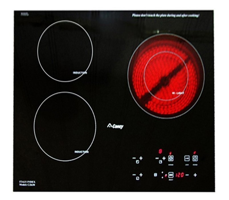 Bếp điện từ chính hãng Canzy này có tổng công suất là 5300W trong đó vùng nấu hồng ngoại có công suất là 2200W, vùng nấu từ nhỏ có công suất là 1300W, vùng nấu từ lớn công suất là 1800W. Bạn có thể sử dụng tối đa công suất 3 bếp cùng 1 lúc nhằm tiết kiệm thời gian vào bếp. Bên vùng nấu từ nguồn năng lượng được tạo ra sẽ không tác động trực tiếp lên mặt bếp nên mặt bếp không nóng mà chỉ nóng do nước sôi truyền nhiệt ngược lại. Hơn nữa, với nguyên lý hoạt động chỉ tác dụng với đáy kim loại nhiễm từ nên truyền nhiệt sẽ nhanh hơn rất nhiều so với bếp gas. Vùng hồng ngoại có thể sử dụng mọi loại nồi như : nồi đồng, inox, thủy tinh, sành, sứ, nhôm và nồi đất. Khi cần thiết có thể nướng đồ ăn ngay ở trên mặt bếp và có thể dùng nhiệt dư sau khi nấu để giữ ấm thức ăn.