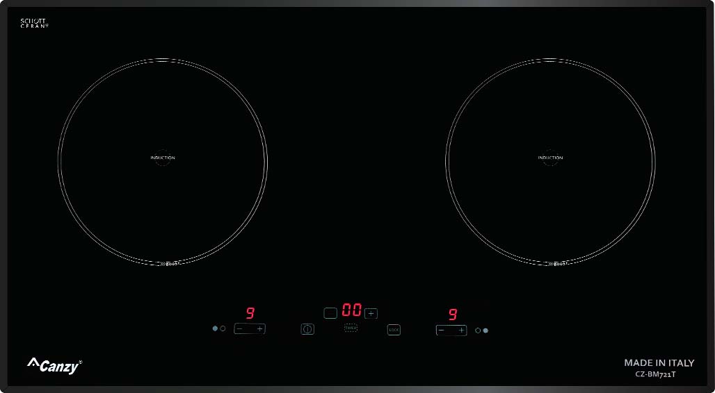 Bếp từ chính hãng Canzy CZ BM721T gồm 2 vùng nấu từ sử dụng bảng điều khiển cảm ứng dạng Touch Control gồm 9 cấp độ hiển thị bằng đèn led rất rõ ràng giúp người dùng dễ quan sát và điều chỉnh mức công suất phù hợp nhất cho từng món ăn. Công suất vùng nấu bên phải là 1400W/Booster 1800W, bên trái 1500W/ Booster 2000W. Bếp được trang bị mâm nhiệt EGO với khả năng tự động nhận diện đáy nồi để gia nhiệt, phù hợp với mọi kích cỡ xoong nồi đảm bảo sử dụng lâu dài,tiết kiệm điện năng và tuổi thọ cao. Một trong những yếu tố quan trọng thu hút sự quan tâm của người dùng chính là độ an toàn của sản phẩm do đó Bếp từ nhập khẩu này được trang bị những tính năng an toàn thông minh nhất hiện nay như: