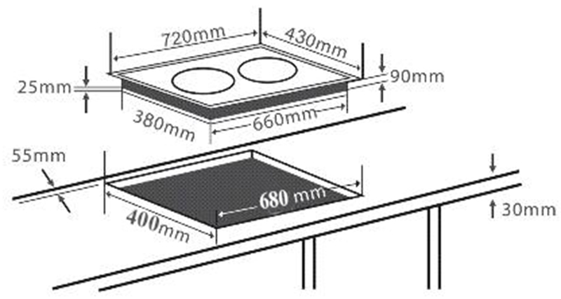 Thông số kỹ thuậtĐiện áp 220V / 50HzCông suất: max 3400W (Phải: 2200W, Trái 2200W )Kích thước (dài x rộng x cao): 720 x 430 x 80mmKích thước khoét lỗ: 680 x 400mmTrọng lượng: 9.0 kgKết cấu khung vỏ: bằng thép sơn cách điệnLắp đặt: lắp âm hoặc để nổ