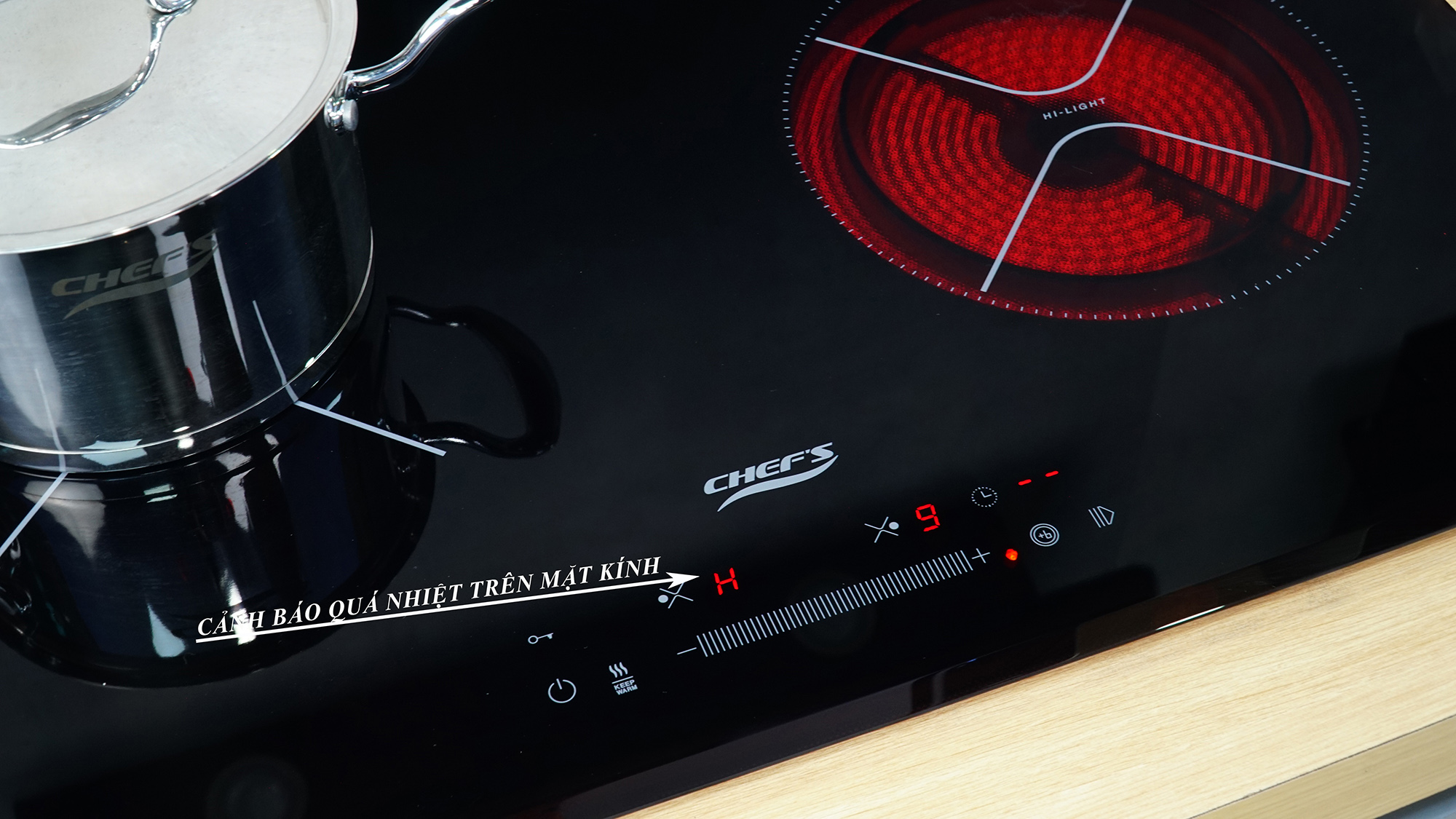 Chỉ báo nhiệt dư “H” được hiển thị cho từng vùng nấu còn nóng: Bếp sẽ cảnh báo bằng chữ “Hot” nhấp nháy khi vùng nấu còn nóng nhiệt độ trên 60ºC sau khi đun, chữ “Hot” sẽ tự mất đi khi mặt bếp đã được tản giảm xuống dưới 60ºC không còn nguy hiểm.