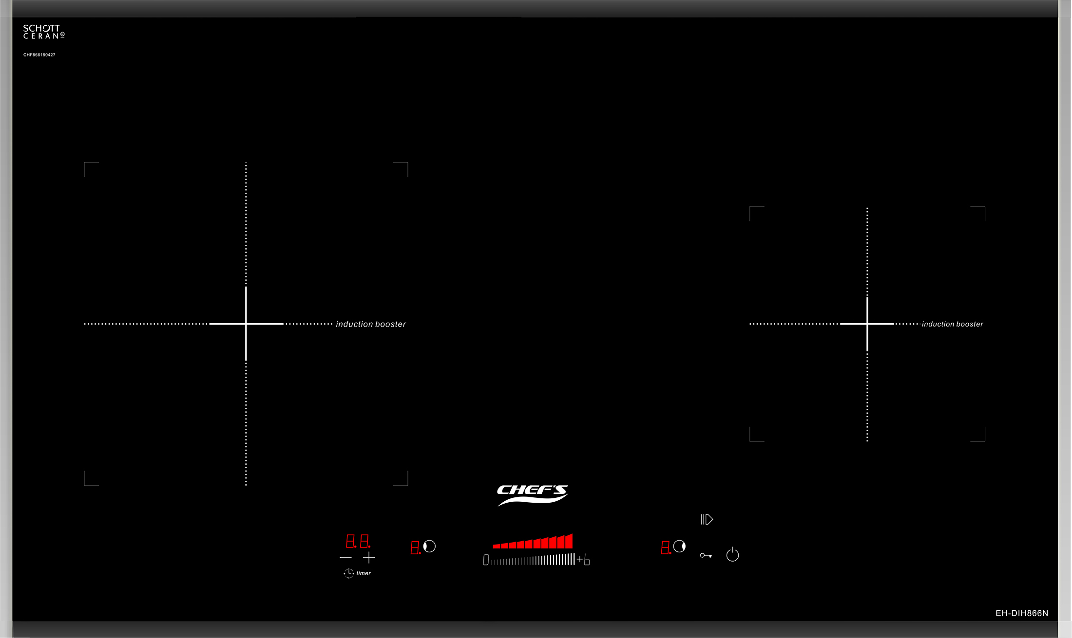 Bếp từ Chefs EH-DIH866N gồm 2 vùng nấu với tổng công suất chia sẻ là 3800W. Vùng nấu trái với công suất là 1500W khi kích hoạt tính năng nấu nhanh siêu tốc Booster công suất lên tới 2000W. Vùng nấu phải với công suất là 1600W. Chỉ trong chốc lát sau khi kích hoạt tính năng này, nhiệt lượng trên vùng nấu từ tăng lên công suất tương đương với mức nhiệt lượng lớn nhất. Do đó, các món ăn được nấu chín nhanh hơn, tiết kiệm thời gian vào bếp cho chị em nội trợ. Chức năng Booster nấu siêu nhanh, tuy nhiên thời gian tối đa mặc định dùng chức năng này là 10 phút / lần tránh quá tải.